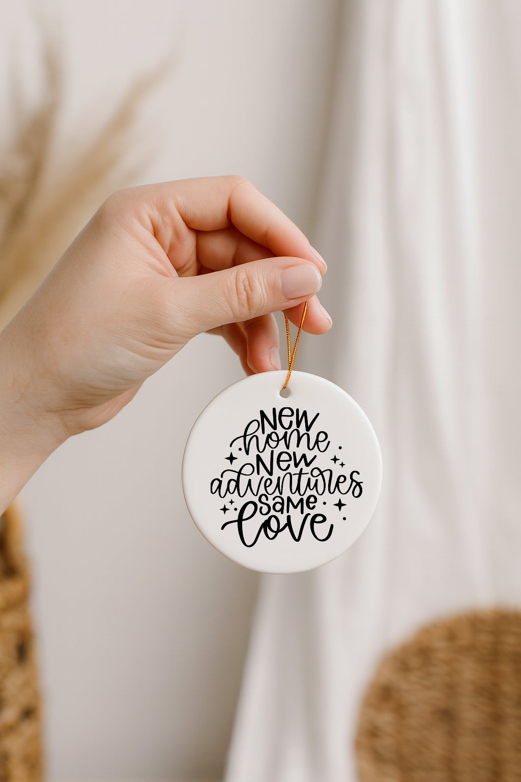 Celebrate the season with our handmade "New Home" Christmas ornaments, professionally sublimation printed in our home studio. Each 2.75" round ornament features a glossy finish for a premium look and comes ready to hang with a shiny gold string—perfect for effortless holiday decorating.